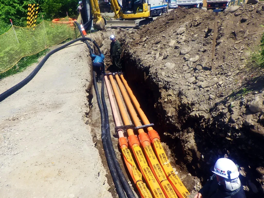 安全で効率的な電力供給を実現する重要な工程です。敷設場所やルートを計画し、地質調査を行います。掘削し、ケーブルのスペースを作り、埋設管を設置します。その後、高圧ケーブルを敷設し、曲げ半径や引き込み速度に注意して作業します。